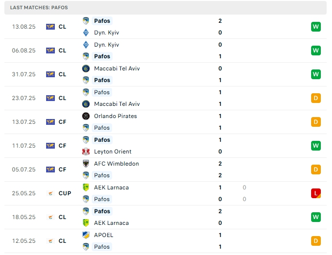 Pafos là đại diện đến từ Cypus, đội bóng này sở hữu lối chơi phòng ngự số đông, cả 5 trận gần nhất của họ khép lại không quá 2 bàn thắng, trong đó hàng công mang về 6 bàn thắng cùng hàng thủ nhận chỉ 2 bàn thua, 4/5 trận xa nhà của họ cũng có kết quả tương tự.