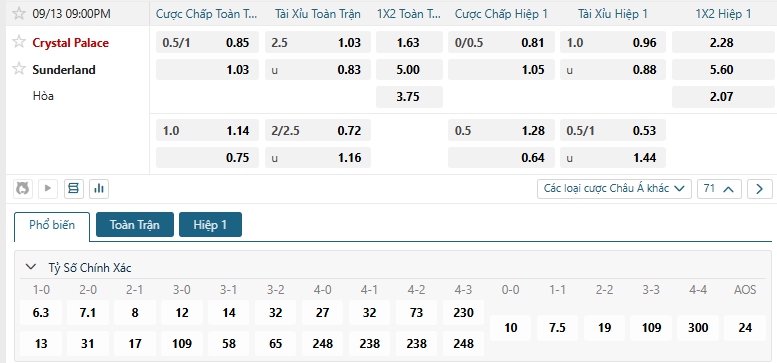 Bảng tỷ lệ kèo bóng đá trận đấu Crystal Palace vs Sunderland
