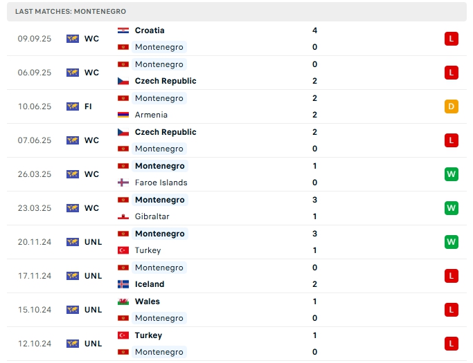 Montenegro sau 5 trận đấu, hàng công của đội bóng này mang về 4 bàn thắng cùng hàng thủ nhận 9 bàn thua nào, 3/5 trận vừa qua của Montenegro khép lại không quá 2 bàn, khi thi đấu xa nhà ở 4/5 trận gần nhất cũng có kết quả tương tự, hàng công đang chơi không quá tốt khiến Montenegro đang gặp nhiều khó khăn.