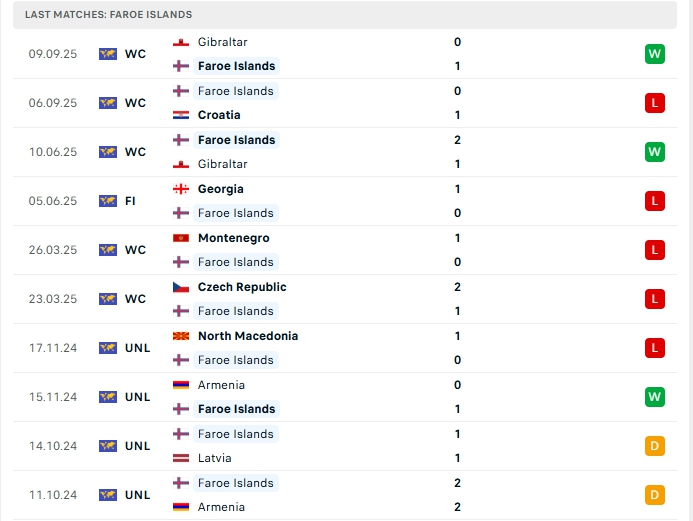 Đảo Faroe bước vào trận đấu này với hàng công có được 4 bàn thắng sau 5 trận đấu cùng hàng thủ nhận 5 bàn thua, 3/5 trận đấu đó khép lại không quá 2 bàn thắng, trên sân nhà của mình ở 3/5 trận gần nhất cũng có kết quả tương tự. Lối chơi của Đảo Faroe thiên về phòng ngự nên những trận đấu của họ thường ít bàn thắng.
