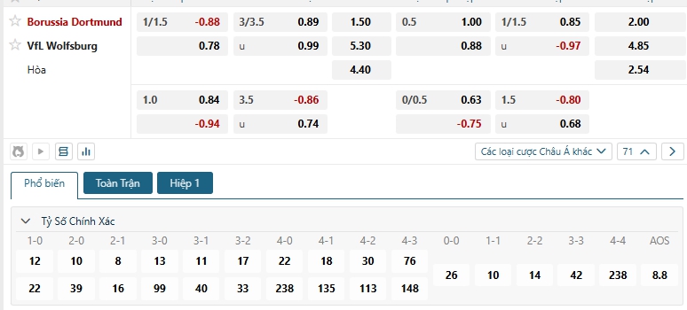 Nhà cái châu Á đang đánh giá cao khả năng chiến thắng của các cầu thủ chủ nhà Dortmund, khi đưa ra mức chấp đang là 1.25, xét về thực lực thì rỏ ràng hai đội có sự chênh lệch lớn, Dortmund sở hữu thực lực vượt trội, chất lượng đội hình , trong khi Wolfsburg dù trải qua chuỗi 3 trận bất bại đầu mùa, hơn nữa lịch sử đối đầu cũng đang ủng hộ Dortmund, trong 5 lần gặp nhau gần nhất thì 4 trong 5 chiến thắng đều là những chiến thắng cách biệt, lựa chọn Dortmund cho kèo Châu Á.