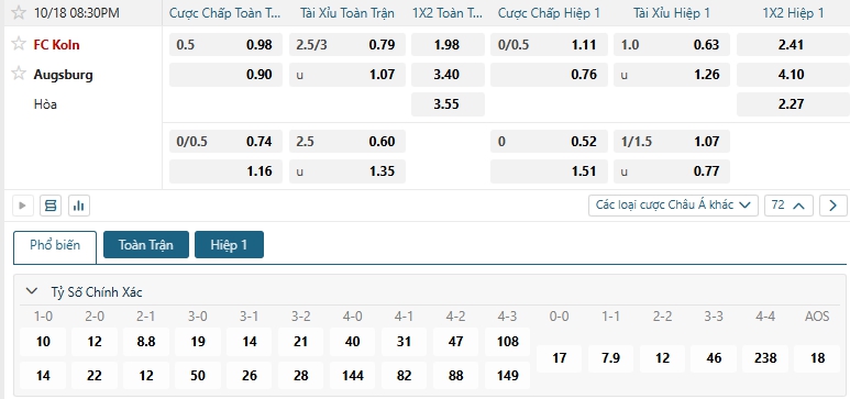 Bảng tỷ lệ kèo bóng đá trận đấu FC Koln vs Augsburg