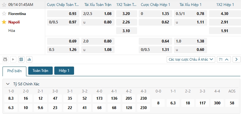Nhà cái châu Á đang đánh giá cao khả năng chiến thắng của các vị khách Napoli, khi đưa ra mức chấp đang là 0.25, Napoli dù phải thi đấu xa nhà nhưng họ được đánh giá cao về thực lực so với đối thủ, Fiorentina có khởi đầu không tốt ở 2 vòng vừa qua, dù có ưu thế sân bãi trong trận đấu tới nhưng chắc chắn họ sẻ gặp nhiều khó khăn, thậm chí đứng trước nguy cơ thất bại trên sân nhà, lựa chọn Napoli cho kèo châu Á.