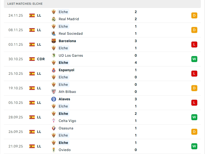 Elche ở 13 vòng đấu đầu tiên, hàng công mang về 15 bàn thắng cùng hàng thủ nhận 16 bàn thua, 3/5 trận gần nhất ở đấu trường Laliga của Elche khép lại không quá 2 bàn thắng, khi thi đấu xa nhà hàng công của Elche không được đánh giá cao.