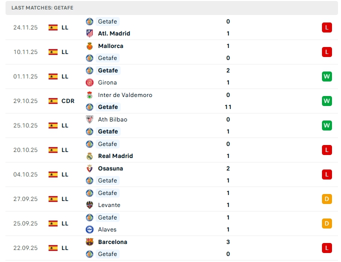 Getafe sau 13 vòng đấu, hàng công của đội bóng này mang về 12 bàn thắng cùng hàng thủ nhận 15 bàn thua, 4/5 trận gần nhất ở đấu trường Laliga của Getafe khép lại 90 phút không quá 2 bàn thắng, trên sân nhà của mình ở 4/5 trận gần nhất cũng khép lại với kết quả tương tự.