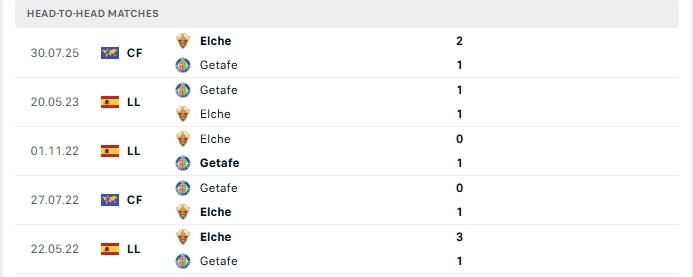 Lịch sử đối đầu của Getafe vs Elche