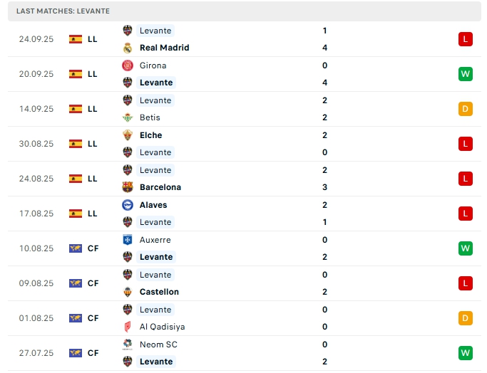 Levante ở 6 vòng đấu đầu tiên, hàng công mang về 10 bàn thắng cùng hàng thủ chơi tệ khi nhận 13 bàn thua, cả 6 trận vừa qua của Levante khép lại từ 3 bàn trở lên, khi thi đấu xa nhà ở 5 trận gần nhất đều vượt mốc trên 2 bàn.