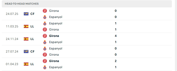 Những màn đụng độ giữa Girona và Espanyol thường diễn ra chắc chắn với ít bàn thắng được tạo ra, 3/5 lần gặp nhau gần nhất của hai đội và lần đón tiếp Espanyol trên sân của Girona khép lại không quá 2 lần lưới rung.
