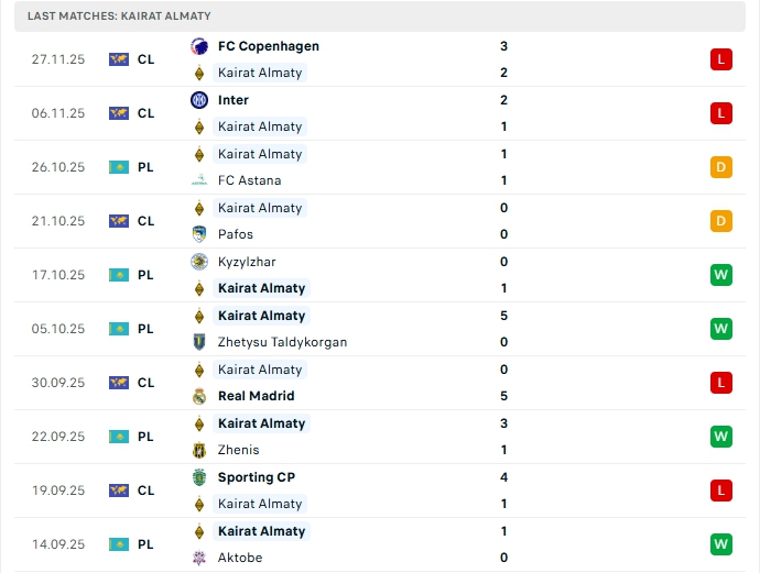 Kairat Almaty vừa nhận thất bại 2-3 trước Kobenhavn ở đấu trường Champions League, sau 5 lượt trận, đại diện Kazakhstan mang về 1 hòa, cùng 4 thất bại, có được 1 điểm và đang xếp vị trí thứ 35 trên BXH, phong độ thời gian qua của Kairat Almaty là không tốt, khi không thắng ở 4 trận gần nhất, trên sân nhà Kairat Almaty hòa 1 và thua 1 ở 2 trận ở đấu trường Champions League.