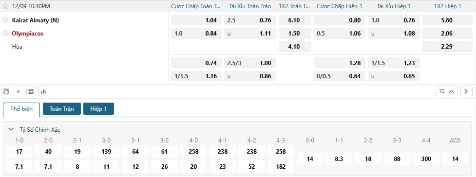 Bảng tỷ lệ kèo bóng đá trận đấu Kairat Almaty vs Olympiakos