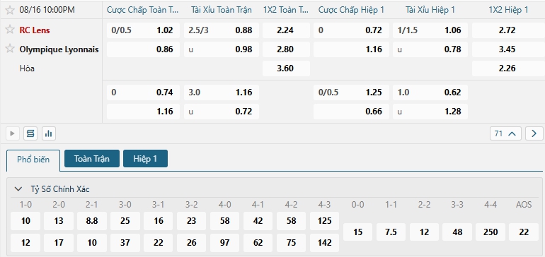 Nhà cái châu Á đang đánh giá cao khả năng chiến thắng của chủ nhà Lens là cao hơn so với Lyon, khi đưa ra mức chấp đang là 0.25, với sự chuẩn bị kỹ lưỡng, ưu thế sân nhà cùng quyết tâm đang có Lens hứa hẹn mang đến nhiều khó khăn cho Lyon, họ hứa hẹn có được chiến thắng cho mình, hơn nữa lịch sử đối đầu cũng cho thấy Lens thường có kết quả tốt trước Lyon, lựa chọn Lens cho kèo Châu Á.