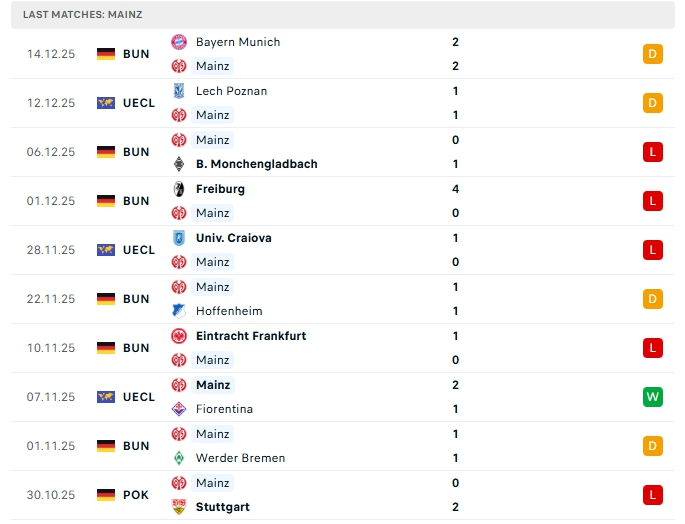 Mainz sau 14 trận đấu, đội bóng này mang về 7 điểm với 1 chiến thắng, 4 hòa và 9 thất bại, xếp vị trí thứ 18 trên BXH, một vị trí trong nhóm cầm đèn đỏ, ở trận đấu gần nhất Mainz có trận hòa 2-2 trước Bayern Munich, đây là trận không thắng thứ 7 liên tiếp, trên sân nhà của mình Mainz cũng thiếu ổn định với 1 chiến thắng, 2 hòa cùng 2 thất bại.