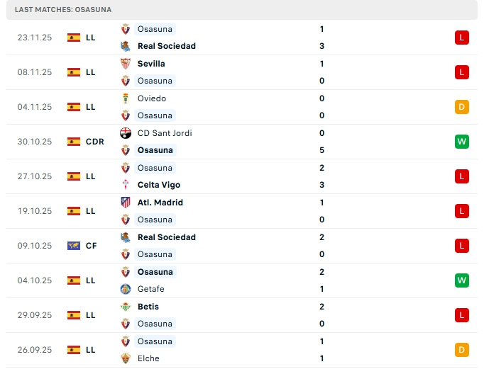 Osasuna ở 13 vòng đấu đầu tiên, hàng công mang về 10 bàn thắng cùng hàng thủ nhận 16 bàn thua, 3/5 trận gần nhất ở đấu trường Laliga của Osasuna khép lại không quá 2 bàn thắng, khi thi đấu xa nhà ở 4/5 trận vừa qua của họ cũng có kết quả tương tự.