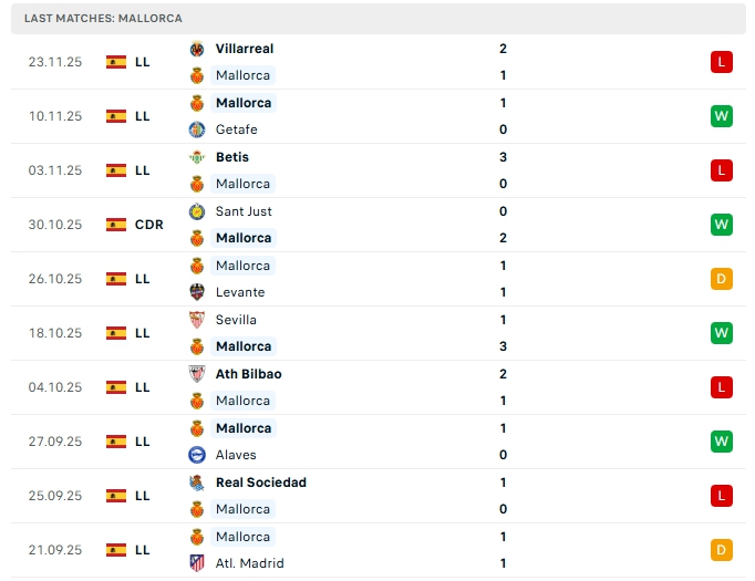 Mallorca sau 13 vòng đấu, hàng công của đội bóng này mang về 13 bàn thắng cùng hàng thủ nhận 20 bàn thua, 3/5 trận gần nhất ở đấu trường Laliga của Mallorca khép lại 90 phút trên 3 bàn thắng được ghi, dù vậy trên sân nhà Mallorca thường nhập cuộc chặt chẻ, trên sân nhà của mình ở cả 5 trận gần nhất khép lại không quá 2 lần lưới rung.