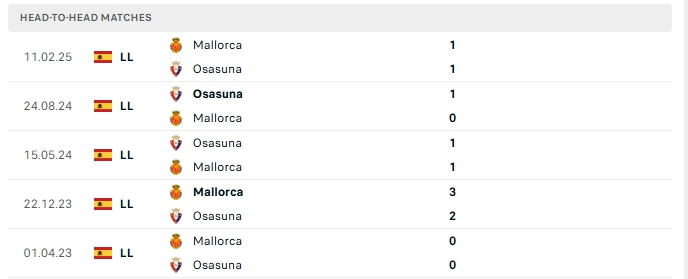 Lịch sử đối đầu của Mallorca vs Osasuna