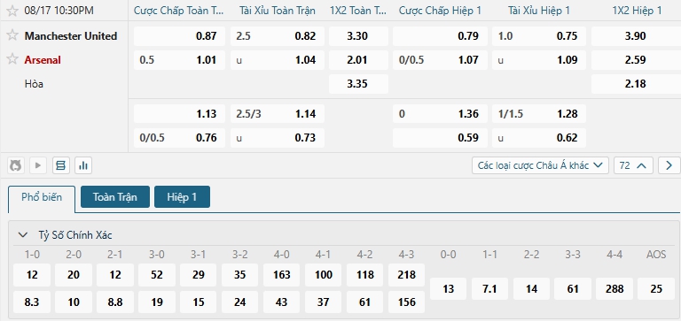Bảng tỷ lệ kèo bóng đá trận đấu Man Utd vs Arsenal