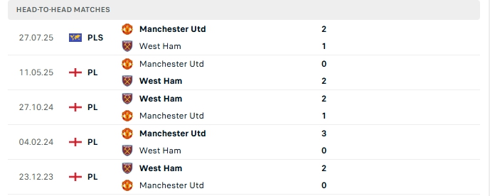 Những màn đụng độ giữa Man Utd và West Ham Utd thường diễn ra hấp dẫn với nhiều bàn thắng được tạo ra, 3/5 lần gặp nhau gần nhất của hai đội và 3/5 lần đón tiếp West Ham Utd trên sân nhà của Man Utd cũng có kết quả tương tự.