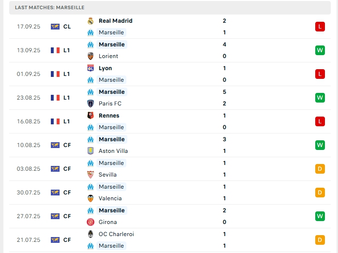 Marseille sau 4 trận đấu đội bóng này mang về 2 chiến thắng cùng 2 thất bại, có được 6 điểm và đang xếp ở vị trí thứ 7 trên BXH, ở ngày ra quân Marseille nhận thất bại 0-1 trước Rennes, sau đó họ trở lại với chiến thắng trước 5-2 trước Paris FC ở vòng 2, tiếp sau đó ở vòng 3 là thất bại trước Lyon, ở trận gần nhất Marseille đánh bại Lorient, rỏ ràng sự ổn định về mặt phong độ không được đánh giá cao, dù vậy trên sân nhà của mình Marseille đang chơi tốt với chuỗi 10 trận bất bại liên tiếp, trong đó có 8 chiến thắng cùng 2 hòa.