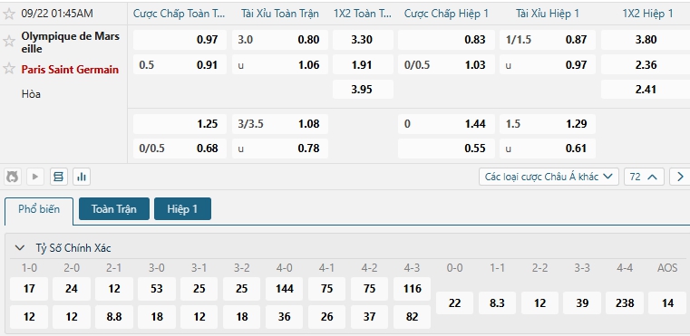 Bảng tỷ lệ kèo bóng đá trận đấu Marseille vs PSG