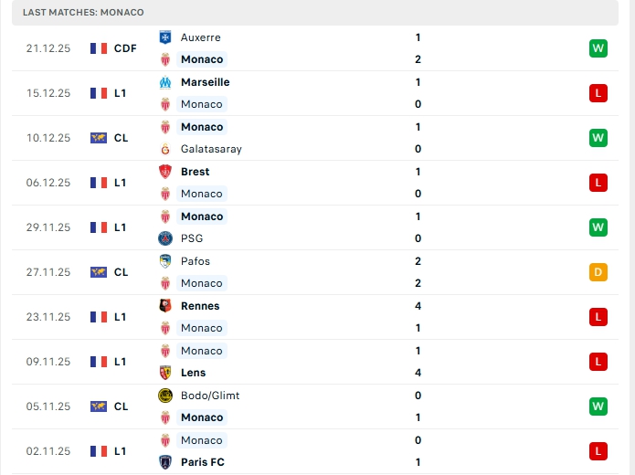 Phong độ gần đây Monaco vs Lyon