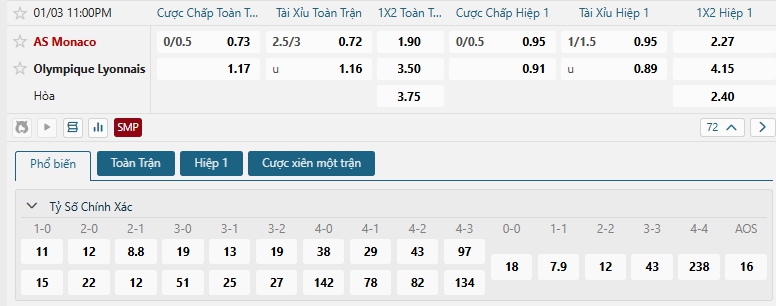 Bảng tỷ lệ kèo bóng đá trận đấu Monaco vs Lyon