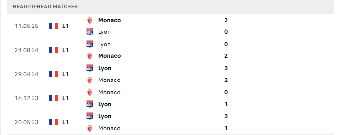 Lịch sử đối đầu của Monaco vs Lyon