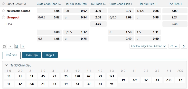 Nhà cái châu Á đang đánh giá cao khả năng chiến thắng của các vị khách Liverpool, khi đưa ra mức chấp đang là 0.25, Liverpool dù phải thi đấu xa nhà, nhưng với phong độ tốt cùng thực lực ấn tượng sẻ giúp họ tự tin hướng đến chiến thắng, Newcastle có ưu thế sân bãi nhưng đội bóng này lại đang chơi tệ, lịch sử đối đầu cũng đang ủng hộ The Kop, lựa chọn Liverpool cho kèo châu Á.