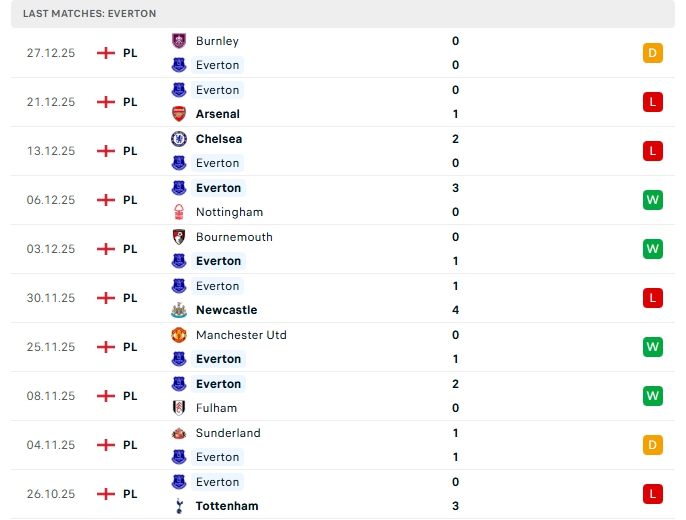 Everton sau 18 lượt trận, hàng công của đội bóng này mang về 18 bàn thắng cùng hàng thủ nhận 20 bàn thua, 4/5 trận vừa qua của Everton khép lại không quá 2 bàn thắng, Everton là đội bóng có lối chơi đầy chặt chẻ và thiên về phòng ngự, khi xa nhà ở cả 5 trận vừa qua của Everton không quá 2 lần lưới rung.