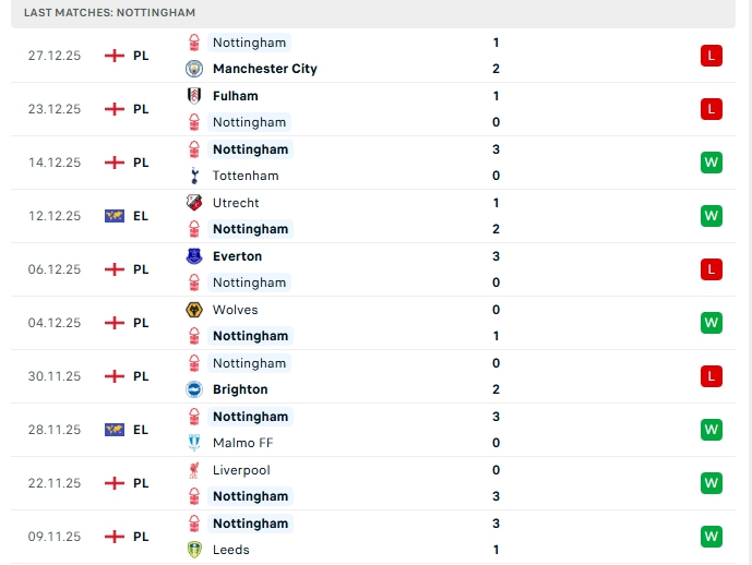 Nottingham Forest sau 18 trận đấu họ mang về 5 chiến thắng, 3 hòa cùng 10 thất bại, có được 18 điểm và đang xếp vị trí thứ 17 trên BXH, ở vòng đấu gần nhất Nottingham Forest nhận thất bại 1-2 trước Man City, đây là thất bại thứ 3 ở 5 trận gần nhất và là trận thua thứ 2 liên tiếp, phong độ thời gian qua cùa Nottingham Forest là không tốt, dù vậy trên sân nhà đội bóng này đang chơi hay với 3 chiến thắng, sau 5 trận đấu.
