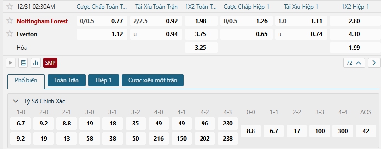 Bảng tỷ lệ kèo bóng đá trận đấu Nottingham Forest vs Everton