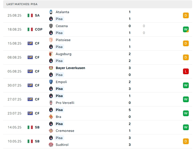 Pisa là tân binh ở mùa giải năm nay, ở trận ra quân, hàng công của họ mang về 1 bàn thắng cùng hàng thủ nhận 1 bàn thua, 3 trận gần nhất của Pisa khép lại không quá 2 bàn thắng, việc bị đánh giá thấp nên Pisa thường chơi chặt chẻ và phòng ngự số đông, nên những trận đấu ở Serie A của họ khép lại với ít bàn thắng.
