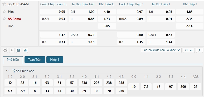 Bảng tỷ lệ kèo bóng đá trận đấu Pisa vs Roma