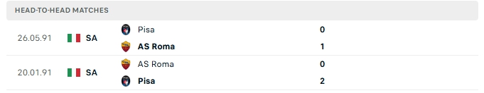 2 lần gặp nhau gần nhất giữa Pisa và Roma đều khép lại không quá 2 bàn thắng được tạo ra, trong đó lần gần nhất đón tiếp Roma trên sân của Pisa cũng chỉ có 1 bàn thắng.