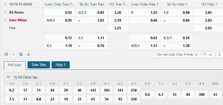 Bảng tỷ lệ kèo bóng đá trận đấu Roma vs Inter Milan
