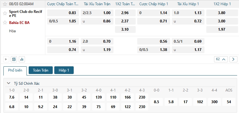 Bảng tỷ lệ kèo bóng đá trận đấu SC Recife vs Bahia