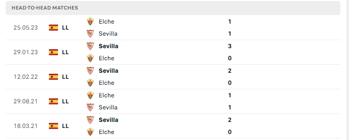 Những màn đụng độ giữa Sevilla và Elche không có nhiều bàn thắng được tạo ra, cụ thể ở 4/5 lần gặp nhau gần nhất và 2/3 lần đón tiếp Elche trên sân của Sevilla khép lại không quá 2 lần lưới rung.