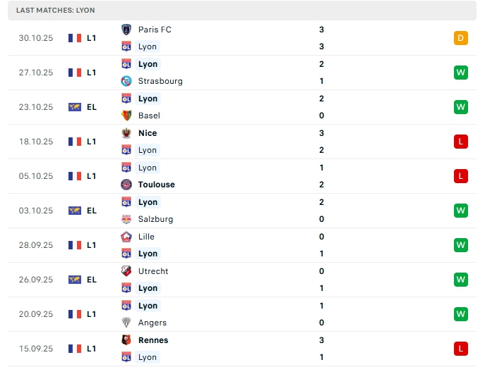 Lyon sau 10 vòng đấu, hàng công đội bóng này mang về 16 bàn thắng, cùng hàng thủ nhận 12 bàn thua, 4/5 trận gần nhất của Lyon khép lại trên 3 bàn, khi thi đấu xa nhà ở 5 trận gần nhất thì có 3 trận vượt mốc trên 3 bàn.