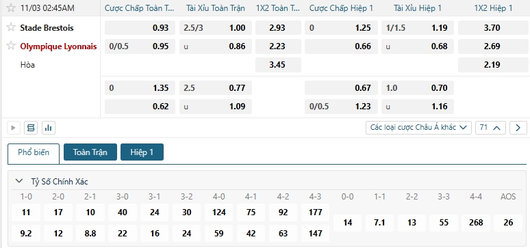 Nhà cái châu Á đang đánh giá cao khả năng chiến thắng của các vị khách Lyon là cao hơn so với Stade Brestois , khi đưa ra mức chấp đang là 0.25, dù có ưu thế sân bãi nhưng việc đang chơi tệ khiến Stade Brestois gặp khó, đặc biệt trên sân nhà họ cũng chơi không tốt, trong khi Lyon được đánh giá cao về thực lực, lựa chọn Lyon ở kèo châu Á.