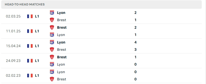 Lịch sử đối đầu của Stade Brestois vs Lyon