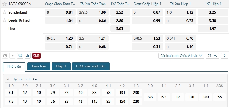 Bảng tỷ lệ kèo bóng đá trận đấu Sunderland vs Leeds Utd
