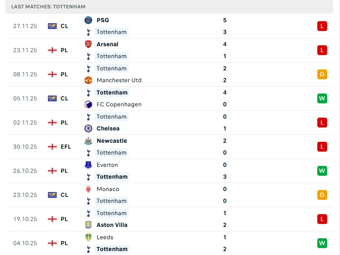 Tottenham sau 12 trận đấu họ mang về 5 chiến thắng, 3 hòa cùng 4 thất bại, có được 18 điểm và đang xếp vị trí thứ 12 trên BXH, ở vòng đấu gần nhất Tottenham nhận thất bại đậm 1-4 trước Arsenal, đây là trận không thắng thứ 3 liên tiếp của đội bóng này , trên sân nhà Tottenham cũng đang chơi không tốt khi chỉ thắng 1, hòa 2 và thua 2 ở 5 trận gần nhất.