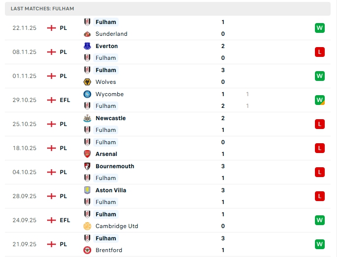 Fulham ở 12 lượt trận đội bóng này có được 13 bàn thắng cùng hàng thủ nhận 16 bàn thua, hàng thủ đang là điểm yếu của Fulham, 4/5 trận xa nhà vừa qua của Fulham cũng vượt mốc trên 3 bàn.