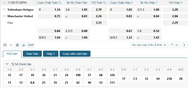 Bảng tỷ lệ kèo bóng đá trận đấu Tottenham vs Man Utd