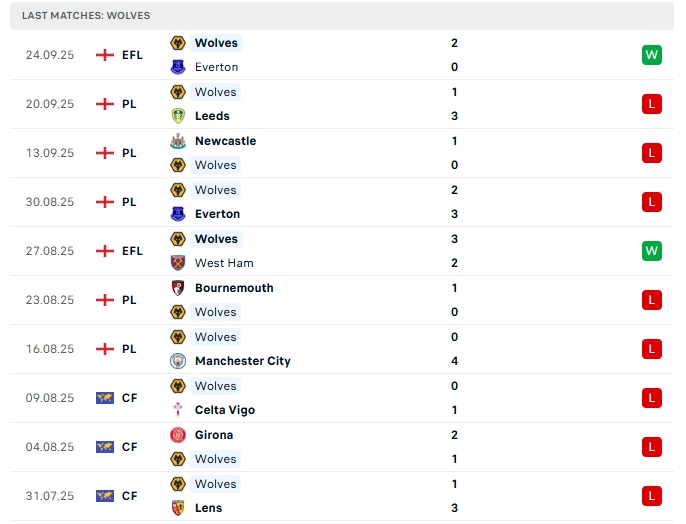 Wolves sau 5 lượt trận đội bóng này có cho mình 3 bàn thắng cùng hàng thủ chơi tệ khi nhận 12 bàn thua, 3/5 trận vừa qua của Wolves khép lại từ 3 bàn trở lên, khi thi đấu xa nhà Wolves cũng đang chơi tệ nơi hàng thủ khi bị các đối thủ chọc thủng lưới ở 5 trận gần nhất, hàng thủ chơi tệ đang khiến Wolves gặp nhiều khó khăn.