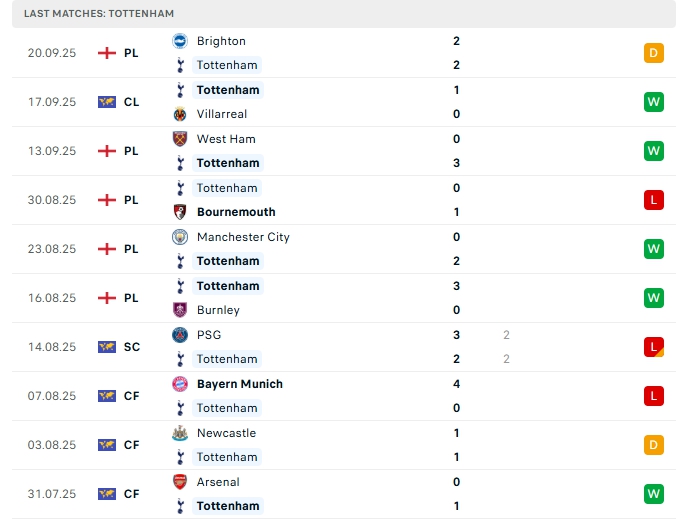Tottenham ở vòng đấu gần nhất họ có trận hòa 2-2 trước Brighton, đây là trận bất bại thứ 3 liên tiếp với 2 chiến thắng trước đó, sau 5 vòng đấu, Gà trống mang về 3 chiến thắng, 1 hòa và 1 thất bại, có được 10 điểm và đang xếp vị trí thứ 3 trên BXH, trên sân nhà của mình Tottenham cũng đang chơi tốt với 2 chiến thắng, 1 thất bại ở 3 vòng gần nhất, mùa giải năm nay Tottenham với sự dẫn dắt của HLV Thomas Frank giúp họ đang chơi ấn tượng.