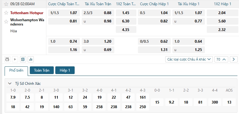 Bảng tỷ lệ kèo bóng đá trận đấu Tottenham vs Wolves