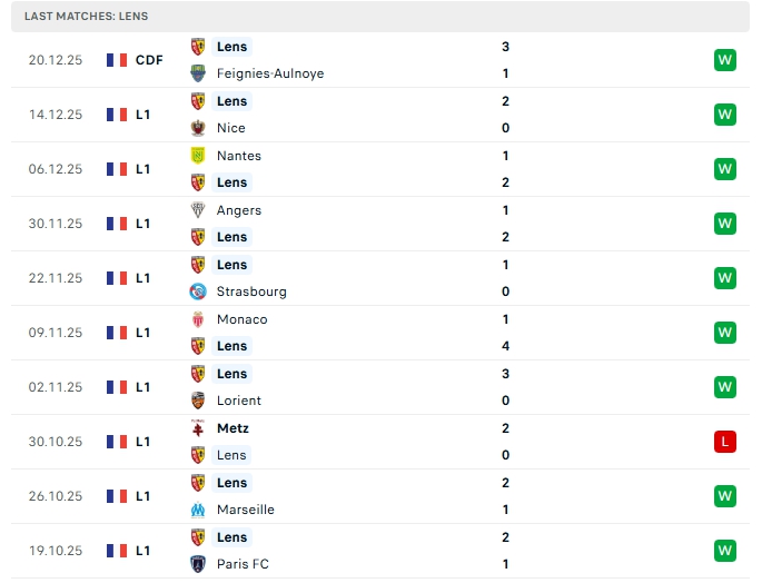 Lens sau 16 trận đấu , hàng công chơi tốt khi mang về 28 bàn thắng, dù vậy hàng thủ nhận 13 bàn thua, hàng thủ đang chơi cực kỳ chắc chắn, Lens nhập cuộc với sự chặt chẻ mỗi khi xa nhà.
