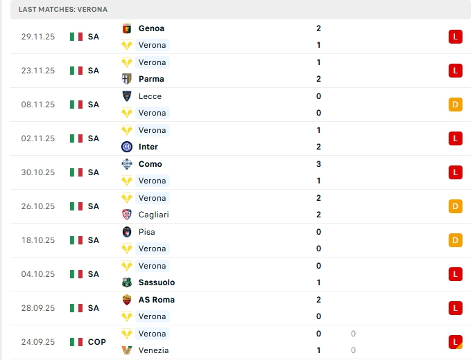 Verona sau 13 trận đấu họ mang về 6 điểm cùng vị trí cuối cùng trên BXH, với 6 hòa và 7 thất bại, ở vòng đấu gần nhất Verona nhận thất bại 1-2 trước Genoa, đây là trận không thắng thứ 14 của đội bóng này, phong độ thời gian qua của Verona là cực tệ, trên sân nhà họ cũng thua 4 và chỉ hòa 1 ở 5 trận gần nhất.