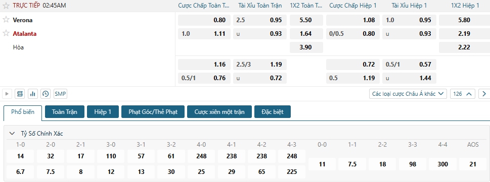 Bảng tỷ lệ kèo bóng đá trận đấu Verona vs Atalanta