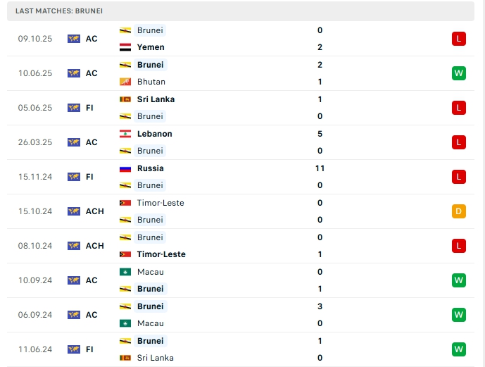 Brunei sau 3 trận đấu, hàng công của đội bóng này mang về 2 bàn thắng cùng hàng thủ nhận 8 bàn thua, hàng thủ chơi thiếu chắc chắn khiến Brunei gặp nhiều khó khăn, 2/3 trận trên sân nhà Brunei cũng khép lại không quá 2 bàn.